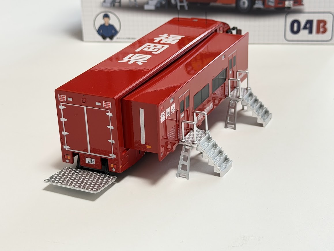消防車の実車取材を経て、実車の特徴でもある可動域も再現(ミニカーでは片側のみ拡幅ギミック)。また、運転席には隊員ドライバーフィギュアと拡幅時にはステップはしごのアクセサリーも接続できます。パッケージも消防本部(局)の公式エンブレムも入り、ご当地消防署のオリジナリティもファンにとっては嬉しいところです。