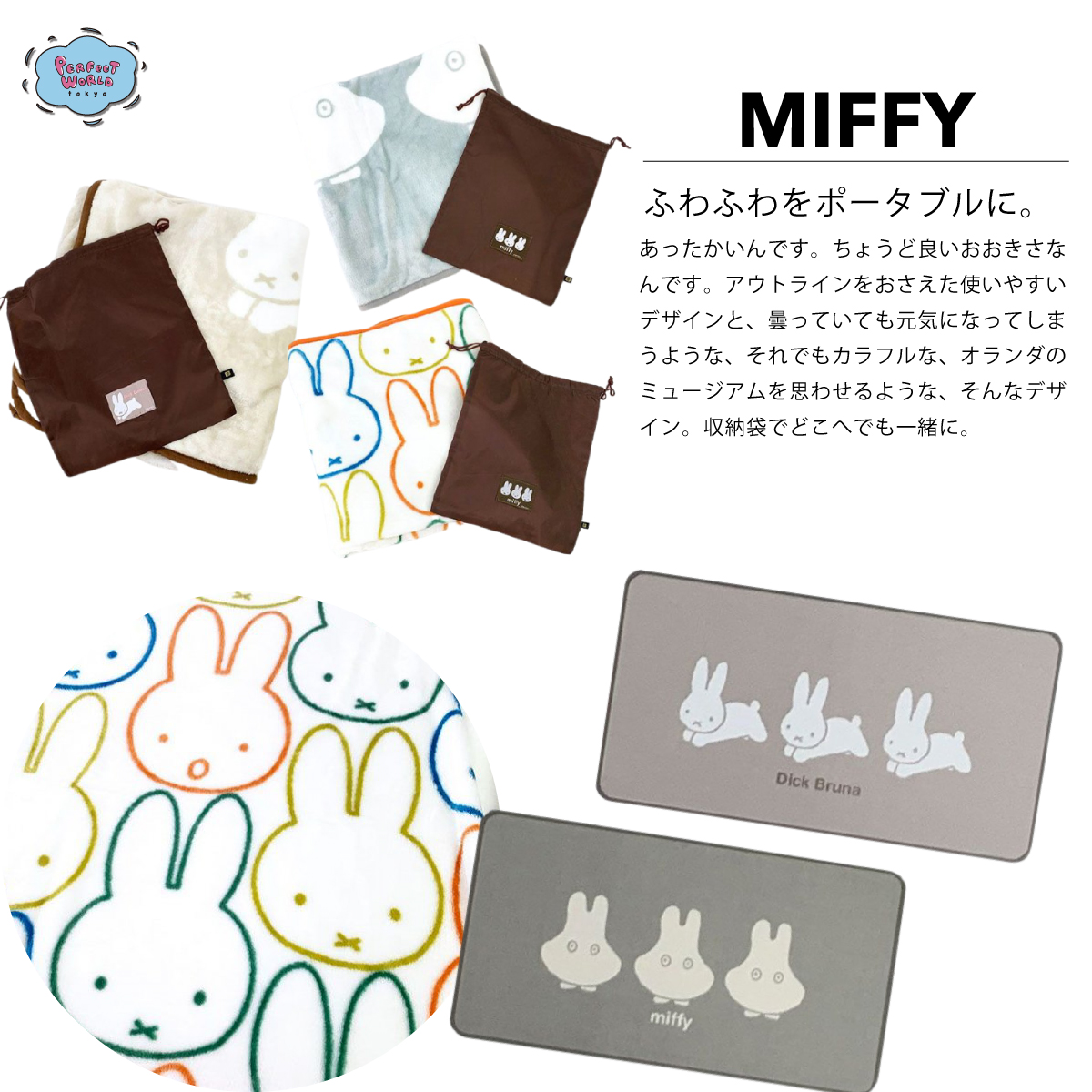 ますます寒くなってきて、お部屋の中やオフィス内で足元が冷えるという方に朗報です。ミッフィーのあったかブランケットは、収納袋もついているので携帯にも便利。ミッフィーのキュートなデザインにほっこりしてくださいね。