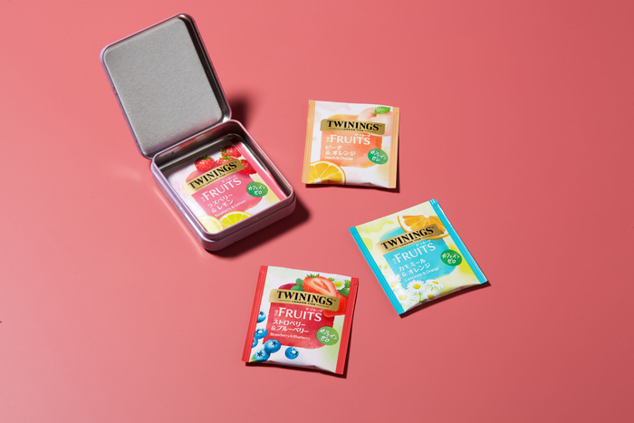 2種類のデザインの缶にはそれぞれ個性豊かなティーバッグを詰め合わせました。華やかでキュートなピンクの缶には、果実感あふれるフレーバーノンカフェインティー「ザ・フルーツ」の4種、爽やかなブルーの缶には、コクのあるまろやかなブレンド「ロンドン テイスト 1706」と、優雅な香りの「アール グレイ クラシック」が入っています。オフィスやお出かけ先などに持ち運んで、いつでも手軽にティータイムをお楽しみいただけます。