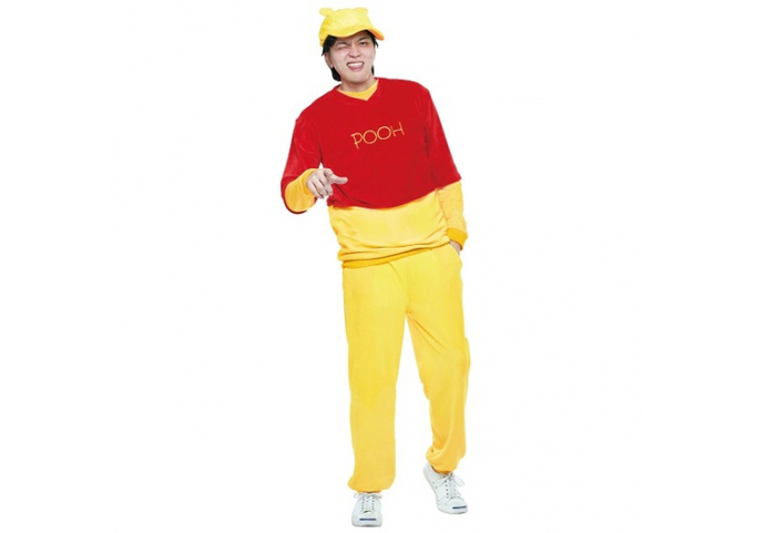 まずはプーさんのコスチュームを発見!ベロア風のやわらかな生地でできた、スウェットタイプのプーさんです。派手な赤と黄色で、イベントでも目立つこと間違いなしでしょう。