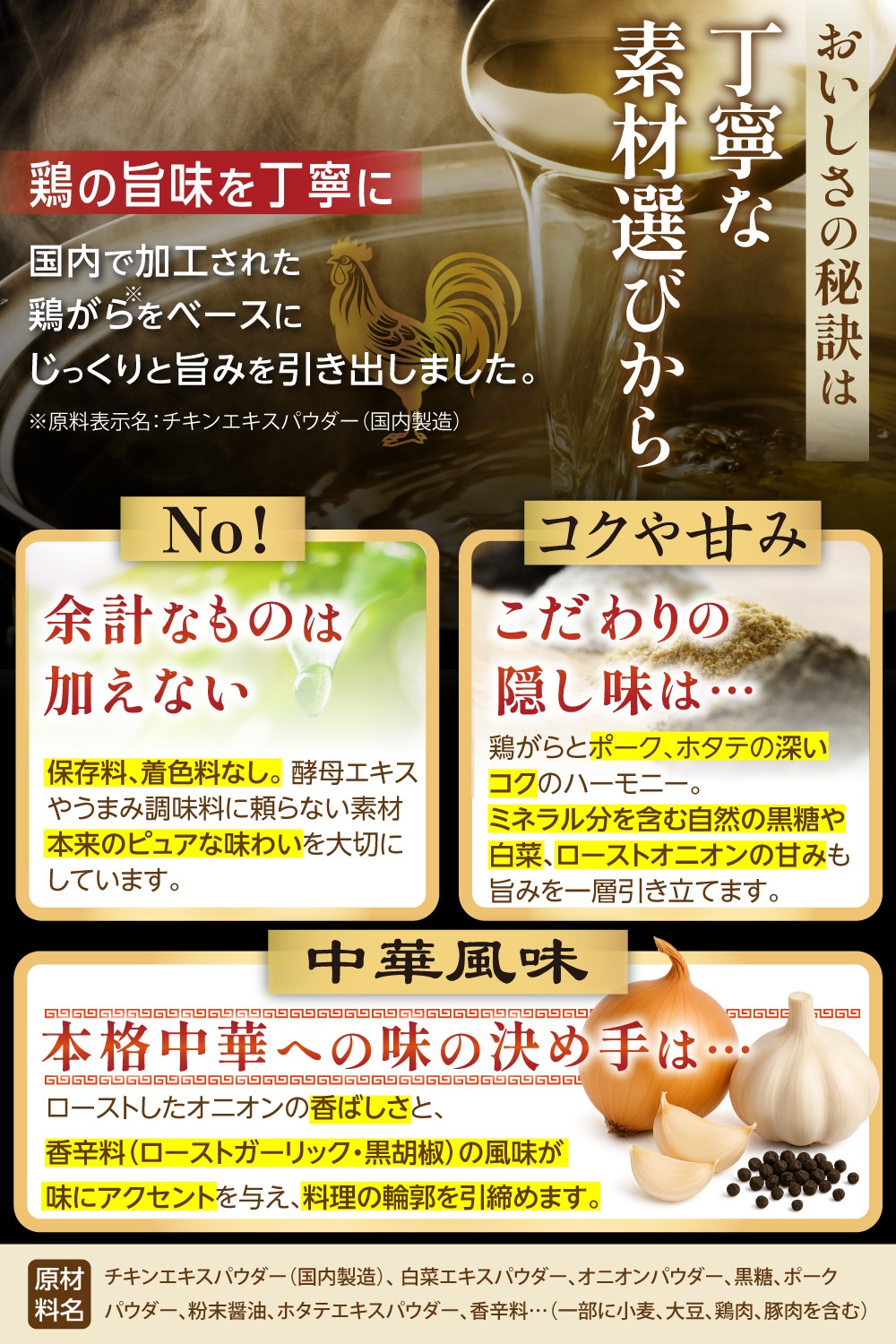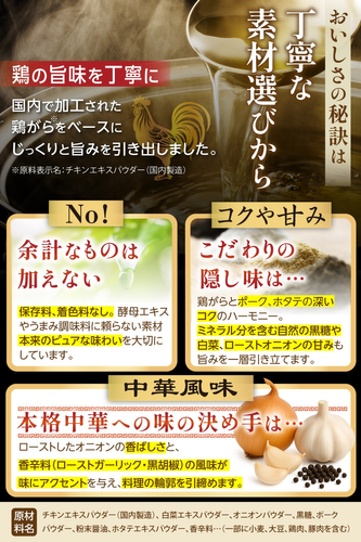 1.「鶏がら」が主役の本格的な旨味: 主原料に「食塩」ではなく、国内で丁寧に加工された「鶏がらチキンエキスパウダー」を使用。さらに豚のコクを合わせたWエキスで、力強い旨みの土台を築きました。