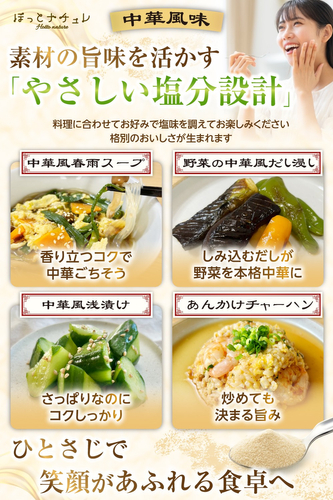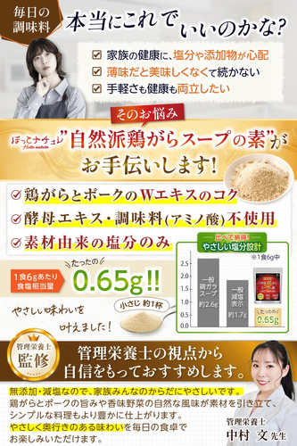 3.管理栄養士と考えた“からだ想い”の塩分設計: 調味目的の食塩を直接添加せず、1食(6g)あたりの食塩相当量を0.65gに設計。一般的な鶏がらスープの素の約1/4にあたる塩分量※で、健康を気づかう方も安心してお使いいただけます。(※日本食品標準成分表2020年版(八訂)中華だし(顆粒)と比較)