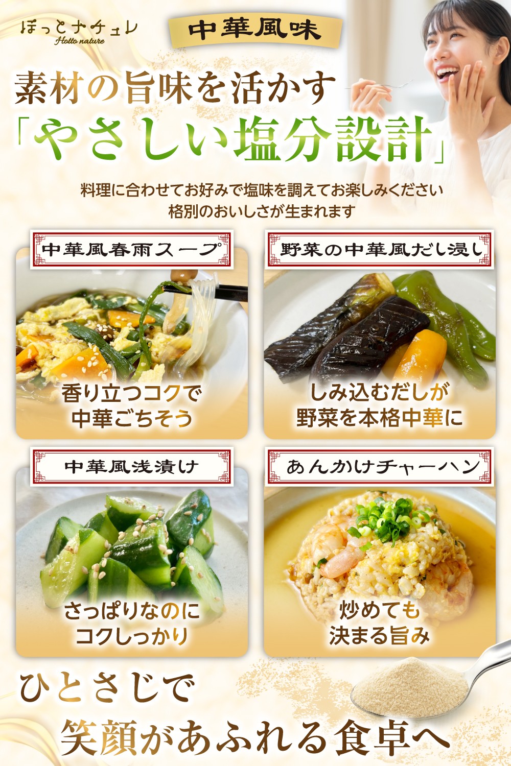 本格的な旨味を追求した『自然派 鶏がらスープの素(中華風味)』を、