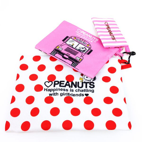 三つめは、ガールズスクールバスの3連ポーチです。大中小のサイズ違いのポーチなんです。柄もそれぞれにキュート♡ドット柄のバスもかわいいですよね。女の子たちの中に、なぜかちゃっかりスヌーピーが混じってます♪