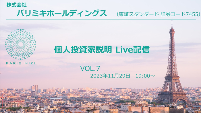 「パリミキ」を展開している株式会社パリミキホールディングス(本社:東京都港区、代表取締役社長:澤田将広)は、ログミー株式会社が提供する、投資家と上場企業との新たな出会いや相互理解を促進し、投資機会を創出するプラットフォーム「logmi IR Live」において、個人投資家向けにオンライン説明会を開催いたしますのでお知らせいたします。