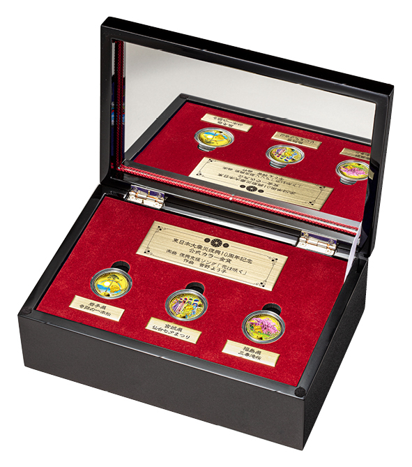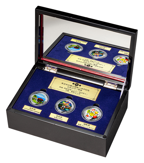 商品名:「東日本大震災復興10周年 公式カラー銀貨 全三点」オルゴール展示ケース付き
