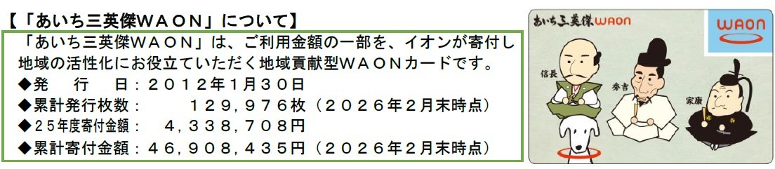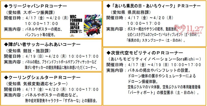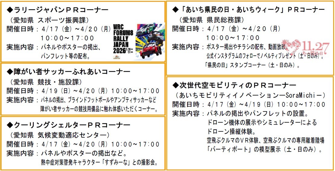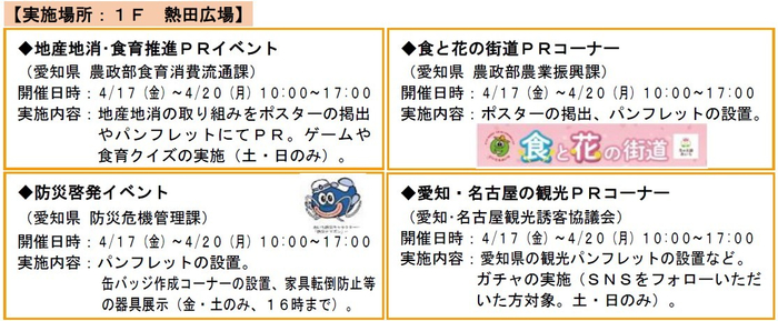 また1階熱田広場では、包括協定に基づき発行された「あいち三英傑WAON」の寄付金贈呈式(4月3日実施)の様子や知事のコメントを紹介するVTRを放映します。また、愛知県が行う様々な取り組みや県の観光などのPR、缶バッジづくりなどワークショップを実施します。