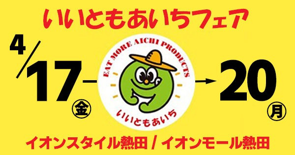 イオンリテール中部カンパニーは、4月17日(金)から20日(月)の4日間、イオンモール熱田およびイオンスタイル熱田(名古屋市熱田区)にて、愛知県と協働し地産地消を推進する「いいともあいちフェア」(以下、当フェア)を開催します。