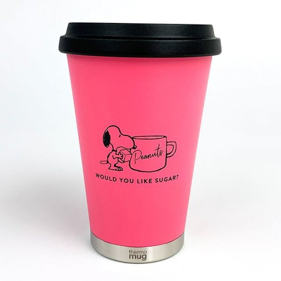 ピンクのキュートなステンレスのモバイルタンブラーです。スヌーピーがカップにお砂糖を入れるデザインもかわいいですね♡