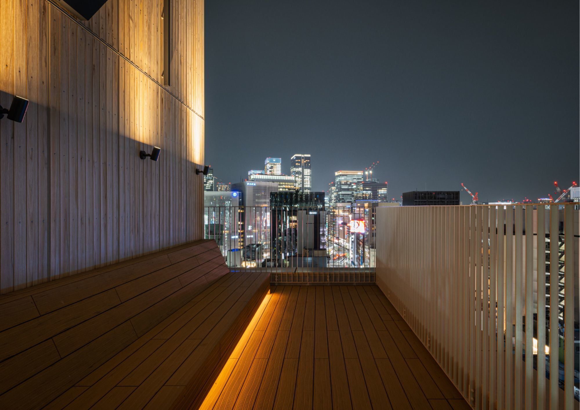 12Fから屋上へとつづく階段を上がると広がるのは、銀座の街並みを一望できるインフィニティテラス。ゆったりと腰を掛けることのできるデッキベンチでの外気浴は、空と景色とが一体となる不思議な感覚をご堪能ください。