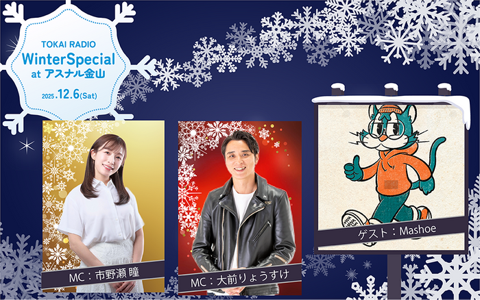 TOKAI RADIOは12月6日(土)に、アスナル金山で「TOKAI RADIO Winter Special at アスナル金山」を実施する。MCは、大前りょうすけ(「<a href="https://www.tokairadio.co.jp/program/ohmy/">OH! MY CHANNEL!</a>」DJ )と市野瀬瞳(「<a href="https://www.tokairadio.co.jp/flavor/">Saturday Flavor</a>」DJ )。