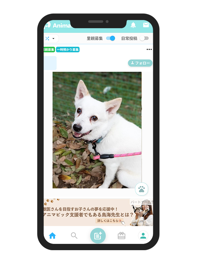 こうした課題を解決するために誕生したのが、支援型SNSアプリ『AnimaPick』です。保護団体は保護動物の里親募集や日常の様子を発信し、利用者はその投稿を見て楽しむことができます。さらに、動物保護活動を支えたい企業が「パートナー」として参加し、アプリに広告を掲載。その広告は投稿と一緒に表示され、投稿した保護団体へ広告費が還元される仕組みです。そのため、利用者は投稿を見るだけで自然と支援につながります。寄付や飼育が難しくても、スマホひとつで命を守る活動に加われることが大きな特徴です。