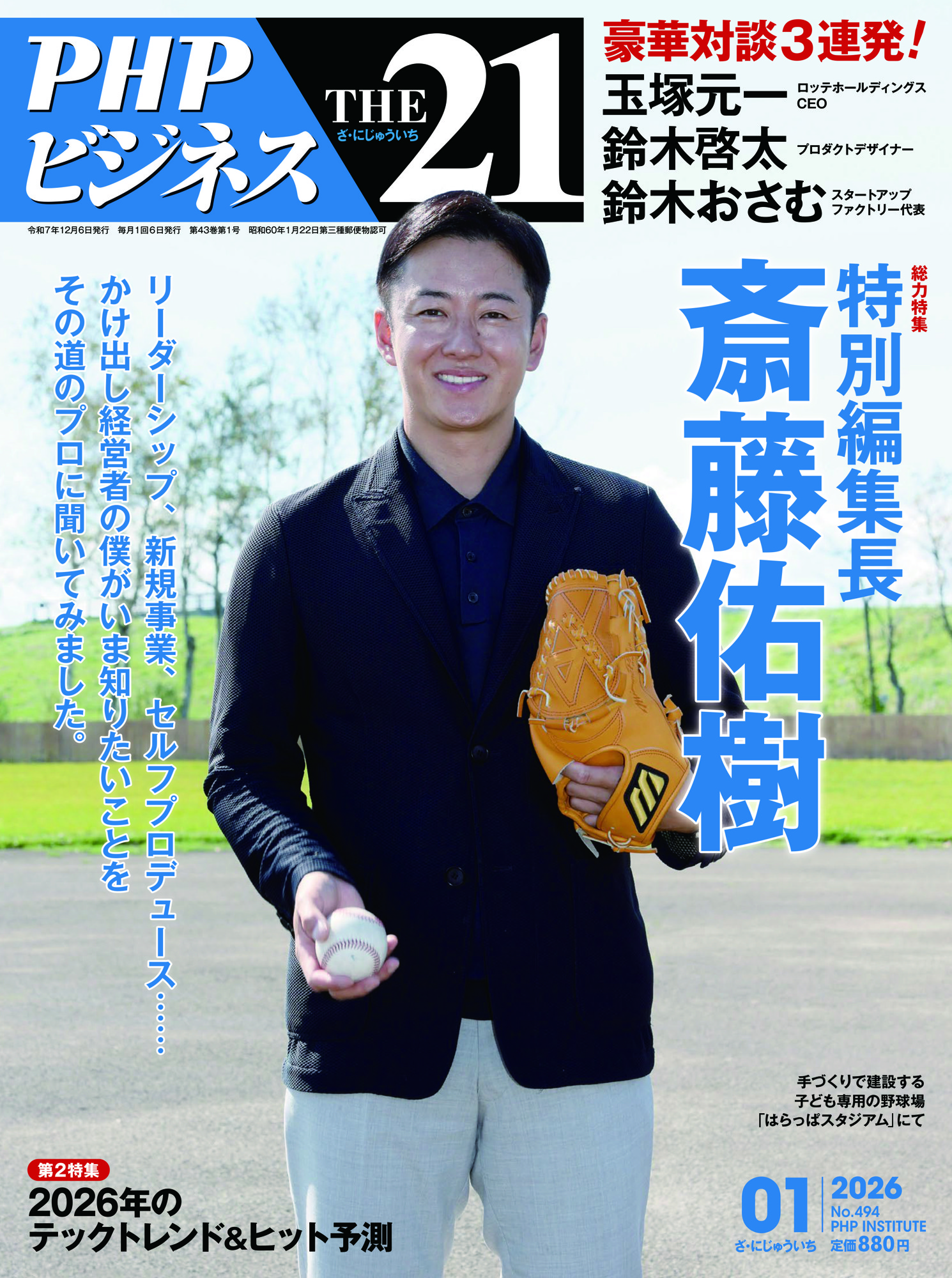 株式会社PHP研究所(京都市南区・代表取締役社長 瀬津要)は、ミドルリーダー向けビジネス誌「THE21」2026年1月号を、2025年12月5日に発売します。元プロ野球選手で、2021年からは株式会社斎藤佑樹の代表を務める斎藤佑樹氏を迎え、「ミドルリーダーの関心が高く、なおかつ斎藤氏も注目する人物・テーマ」で特集を構成。先輩経営者でもある著名人との豪華対談からリーダーとしての学びを得る特集記事まで、斎藤特別編集長とTHE21編集部が経営者のリアルな目線にこだわった、情報満載のスペシャルエディションです。