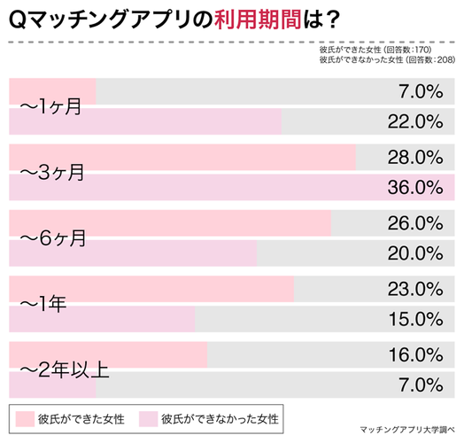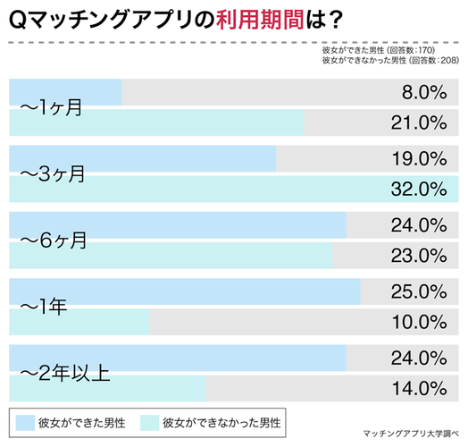 恋人ができた男性は3ヶ月以上の利用が73%に対し、恋人ができなかった男性は3ヶ月以上の利用が57%と全体的に短くなっています。