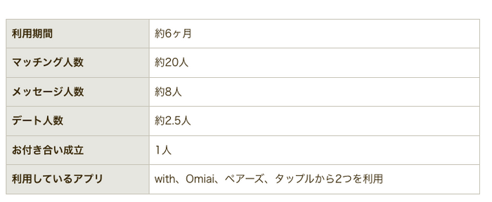 この調査結果を見ることで、自分がマッチングアプリを使った際に、どのような成果が出るのかを考えたり、アンケート結果の平均と比較して自分成果を確認したりしてみてください。