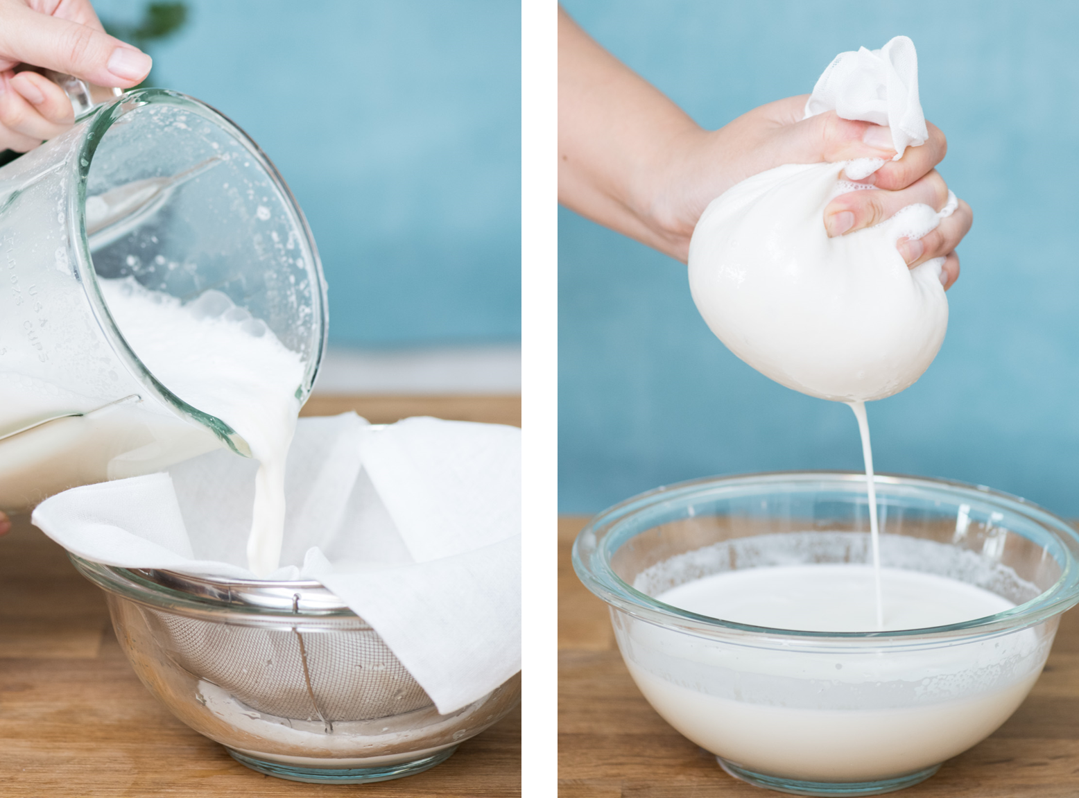 (3) ボウルにザルを重ねて布をかけ(2)を漉す。