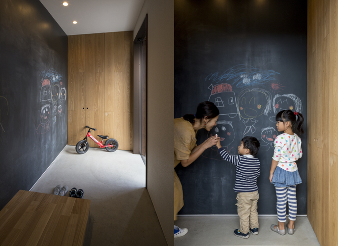 そういった観点で家づくりを進め、玄関の壁に黒板を設置。いつでも子どもたちが自由に落書きできるスペースを作り出しました。