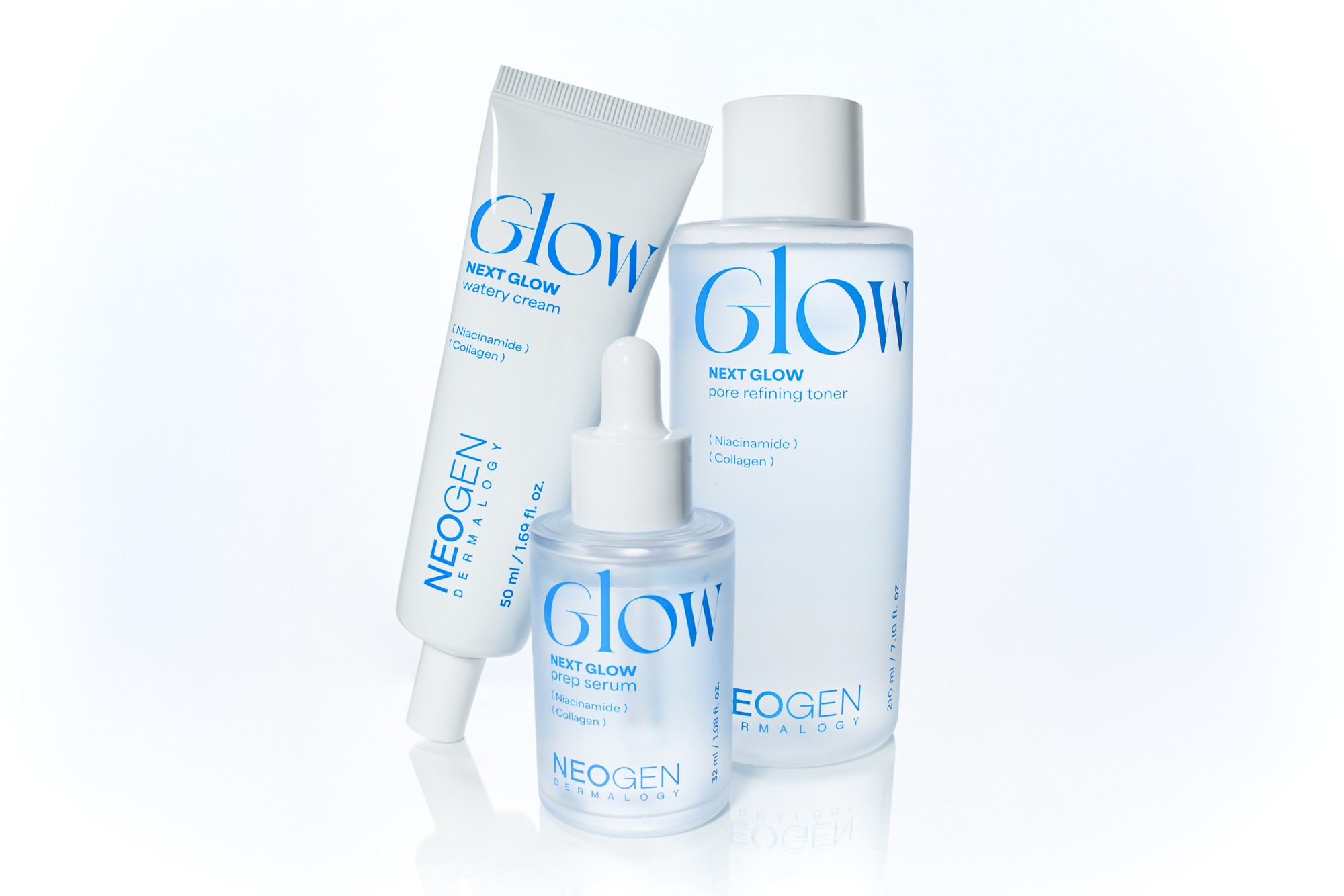 NEOGENブランドから今回新発売となった「NEXT GLOW」ラインは、純度99%のナイアシンアミドを配合し、肌のキメを整え、水分膜でしっかり保湿し、肌の内側からハリと潤いで、使うたびになめらかで明るいツヤ肌へ導きます。