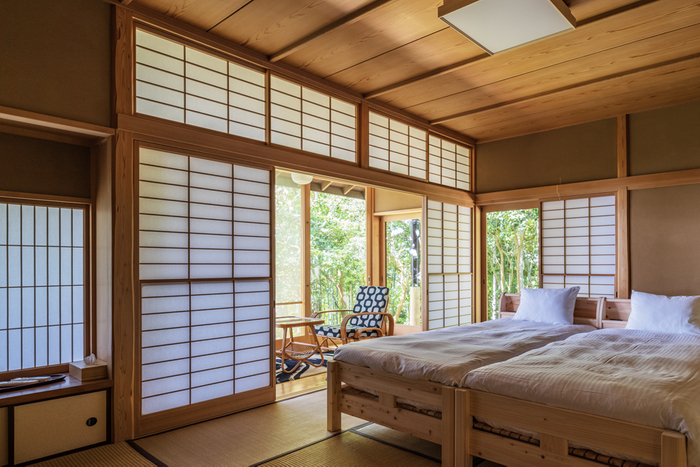 和風平屋建て5LDKの室内は、自然の美しさと和の風情が融合したデザインで特別な空間を演出。24帖の広々としたリビングルームには大きな窓が配置され、自然を感じられるあたたかな光が差し込みます。寝室は畳敷きの和室で日本の伝統的で上質なくつろぎをご提供します。和室から繋がる広縁からは、熱海の優雅な自然と海が広がる景色が楽しめます。