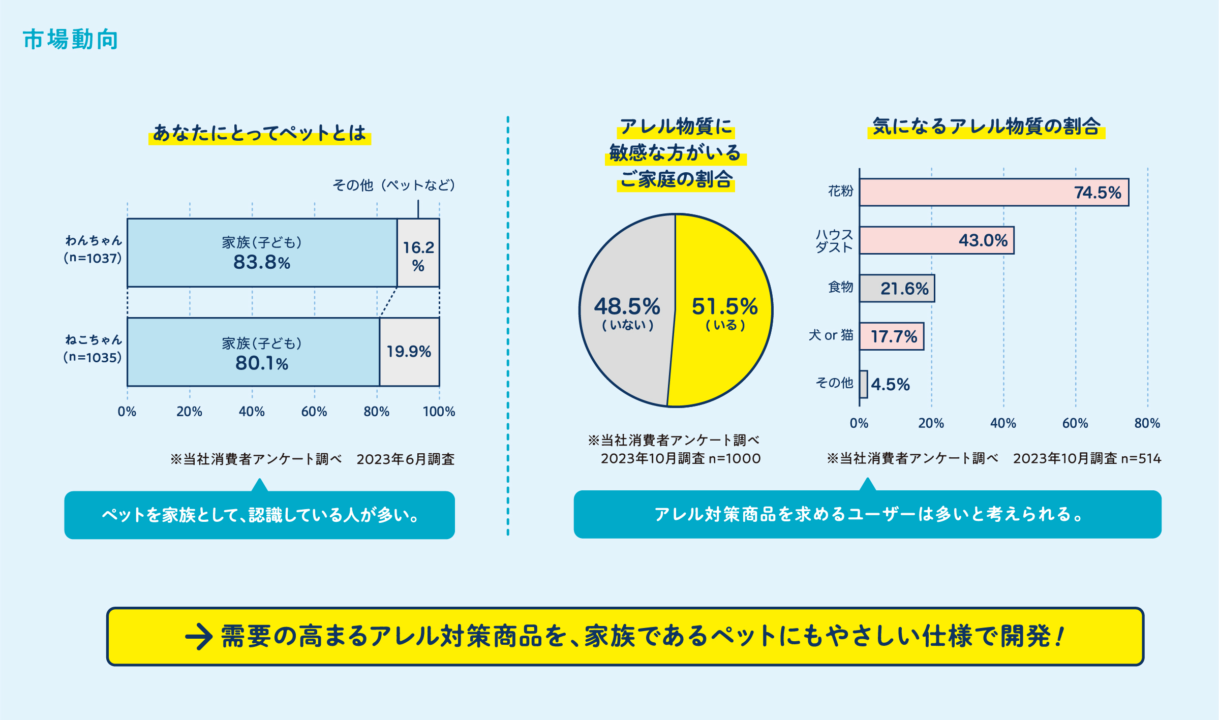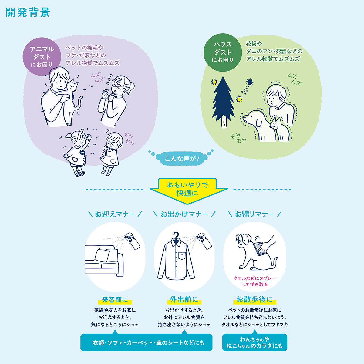 アレルグッバイ(TM)は、ペットの被毛やフケ・だ液、花粉やダニのフン・死骸などのアレル対策商品の需要が高まる中、「家族であるペットにもやさしい仕様」で開発されました。