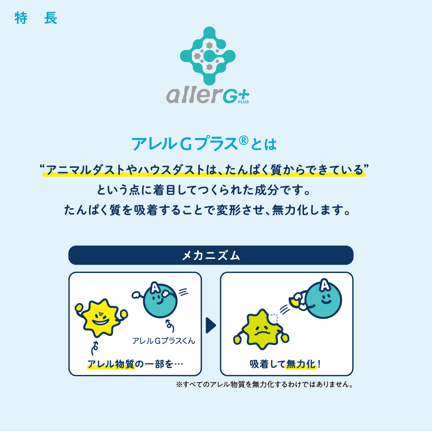 『アレルGプラス(R)』とは、「アニマルダスト」や「ハウスダスト」はたんぱく質からできているという点に着目してつくられた成分です。