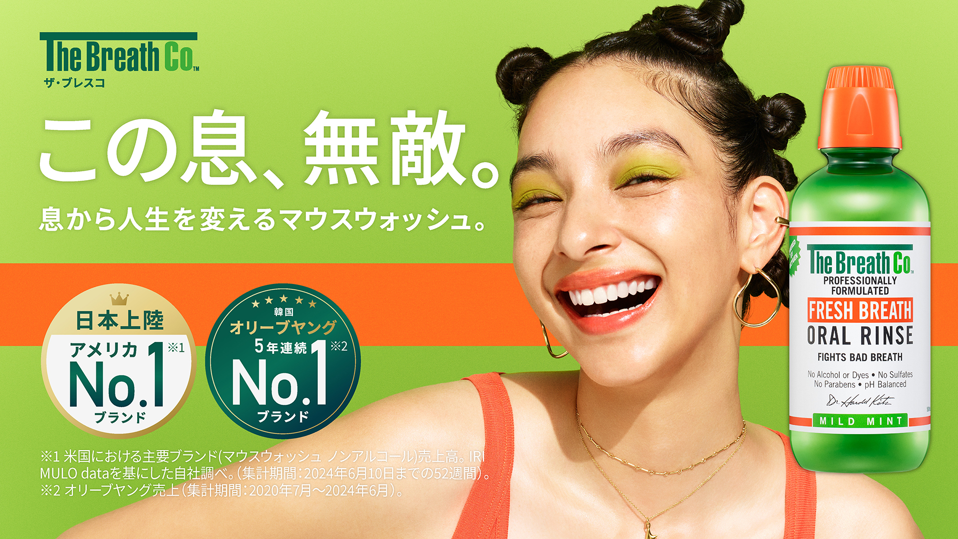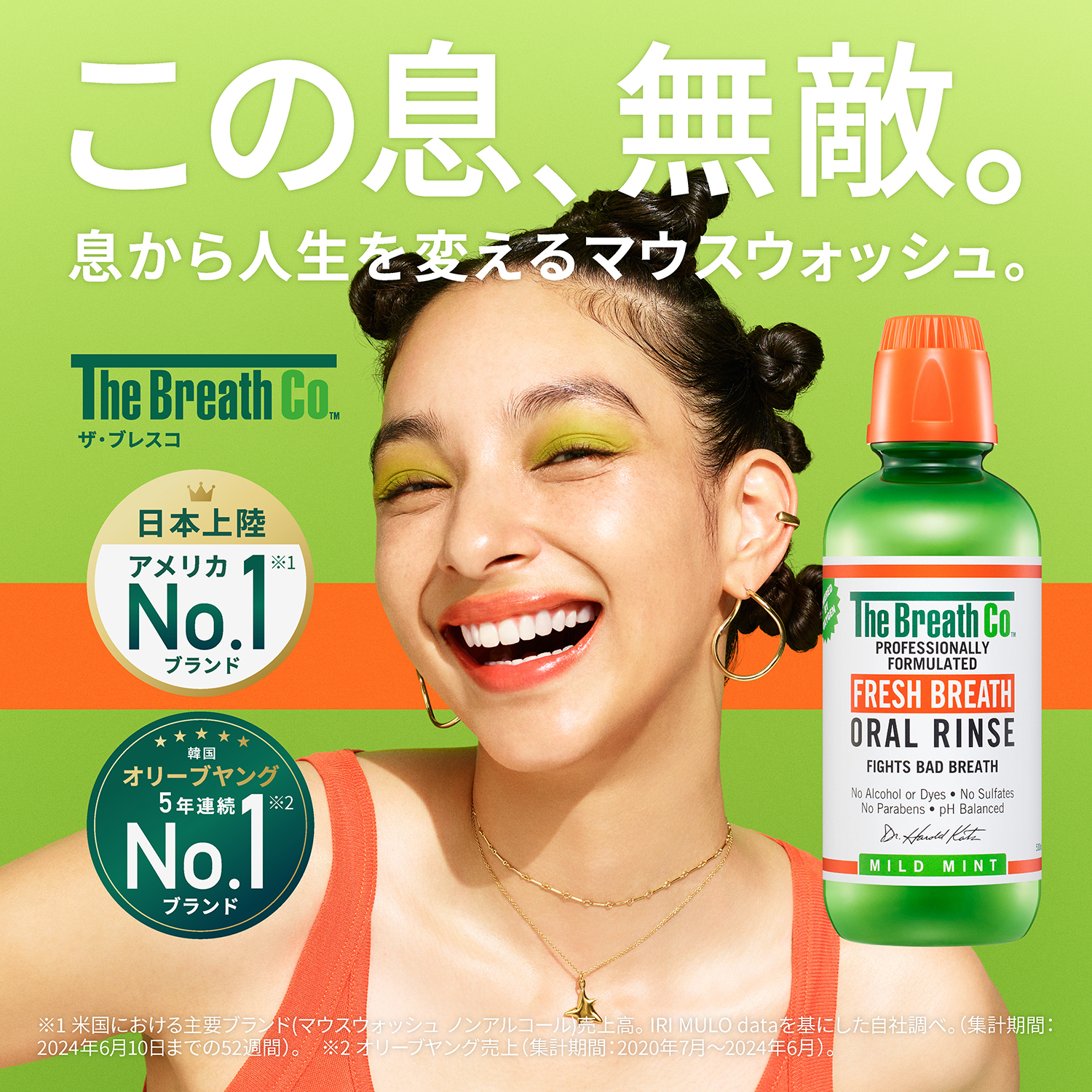 本国アメリカではノンアルコールマウスウォッシュ市場においてNo.1ブランド※1であるほか、世界43か国で展開※3され、韓国のヘルス&ビューティーストア「オリーブヤング」における「デンタルケア」カテゴリーで5年連続No.1※2を獲得しているなど、世界的に注目を集めるマウスウォッシュです。