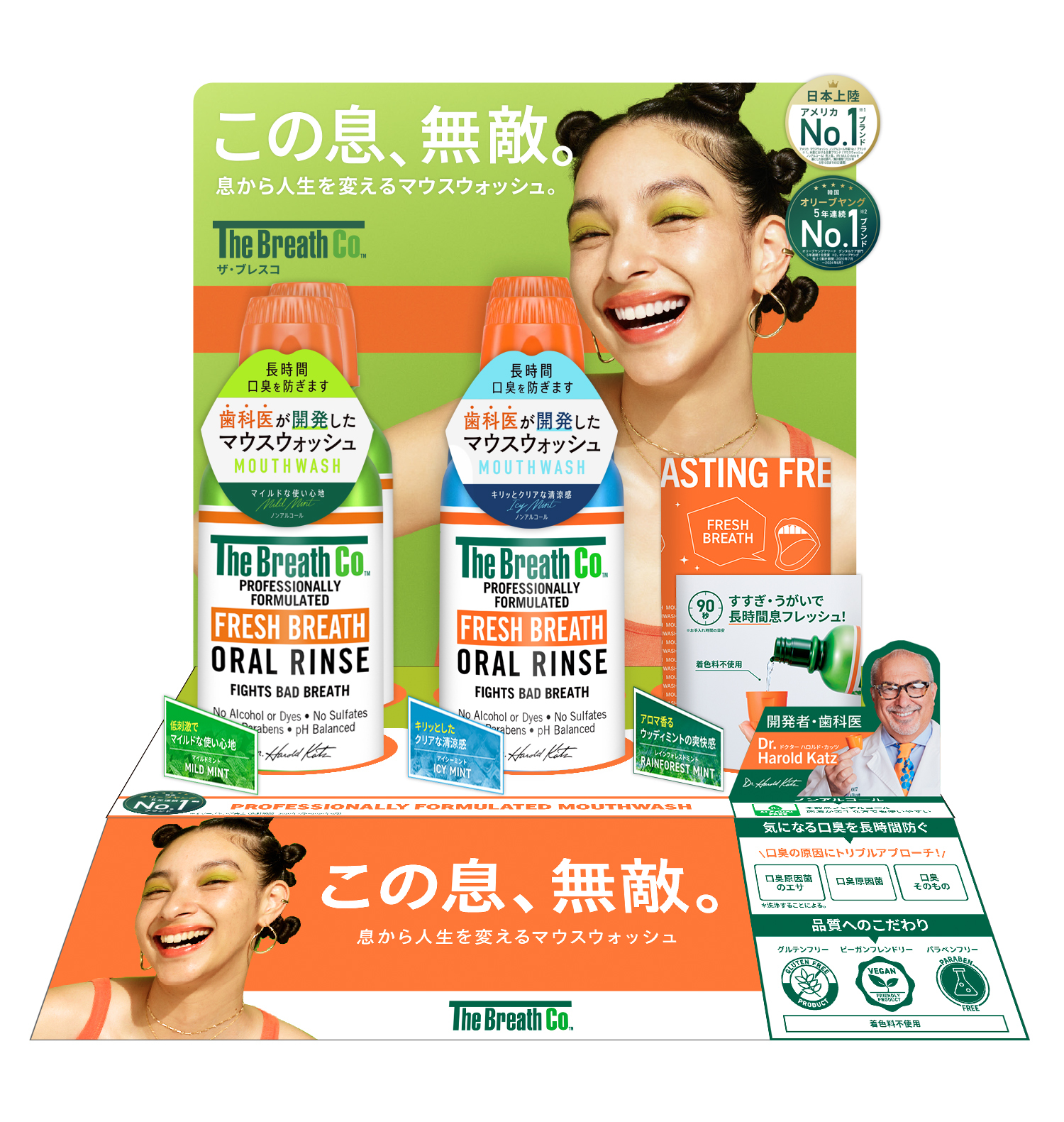 「ザ・ブレスコ」は、アメリカの歯科医であるDr.ハロルド・カッツが娘の重度な口臭悩みを解決するために開発したオーラルケアブランドで、1993年のブランド設立以来、口臭の問題に悩む世界中の人々に愛用されています。