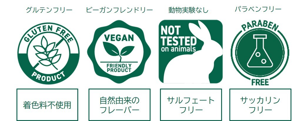 グルテンフリー・ヴィーガン認証・動物実験なし・パラベンフリー・着色料不使用・自然由来のフレーバー・サルフェートフリー・サッカリンフリー