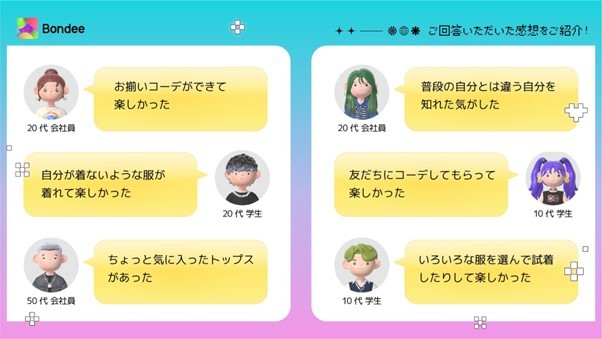 コーデ体験では、Bondeeの着せ替えに類似した服や小物や様々なコーディネートスタイルを揃えました。参加者は好みの服や、普段試せないコーデやBondeeshipメンバーと交流しながら想定できない新しいスタイルを体験していました。アバターと類似した服や小物で着替え、リンクコーデを楽しんでいました。
