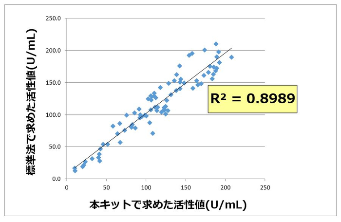この測定法では、標準法のような分析都度の基質溶液の調整や透析などの煩雑な操作が不要で、混合と加熱のみの3ステップ(酵素反応・失活反応・発色反応)です。また分析に必要な各反応時間の合計も、標準法の90分から25分に短縮し、さらに測定値は標準法との相関性が高いことを確認しています。