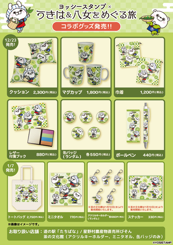 また12月中旬ごろよりコラボアートグッズを、スタンプラリー範囲の道の駅たちばな、星野村農産物直売所びそん、茶の文化館(一部商品)にて販売いたします。