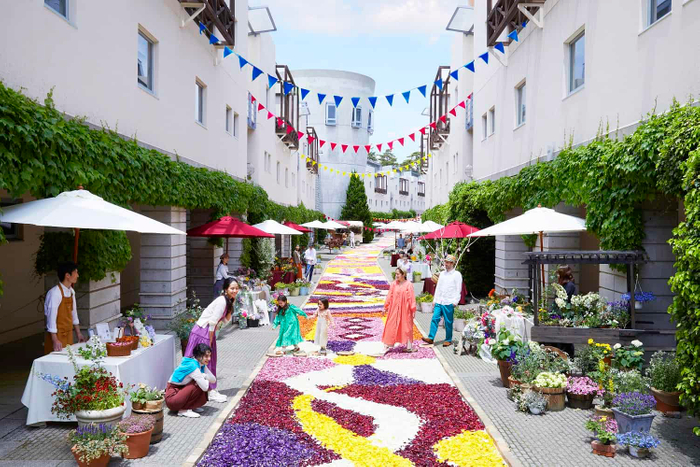 回廊の花咲くリゾナーレは、今年で18回目となる春の定番イベントです。メインストリート「ピーマン通り」に、チューリップの花びらを敷き詰める花の装飾を施します。花の装飾は、今年初めて160メートル切れ間なく続きます。また、花をテーマにしたマルシェやクラフト体験も開催。花があふれるピーマン通りで春のひとときを過ごせます。