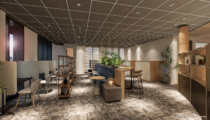 また、ラウンジ内の一部には、『地域活性化』の観点から地元四日市の「萬古焼」を使った照明を採用し、さらには、ビルコンセプトである『環境配慮』という観点から、三重県鳥羽市の海岸において回収された「海洋プラスチックごみ」の再利用材を使用した什器等を採用しています。