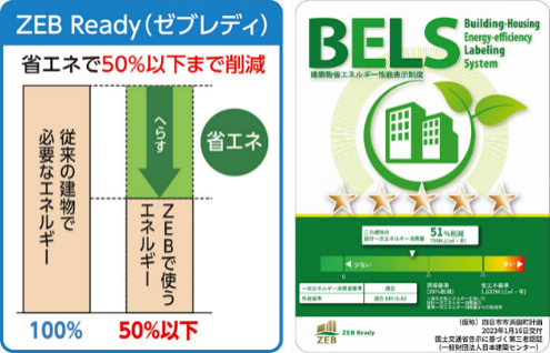 エネルギー負荷の抑制、高効率な照明・空調機器の導入により、50%以上の一次エネルギー消費量の削減に適合した建築物として「ZEB Ready」認証を取得しています。