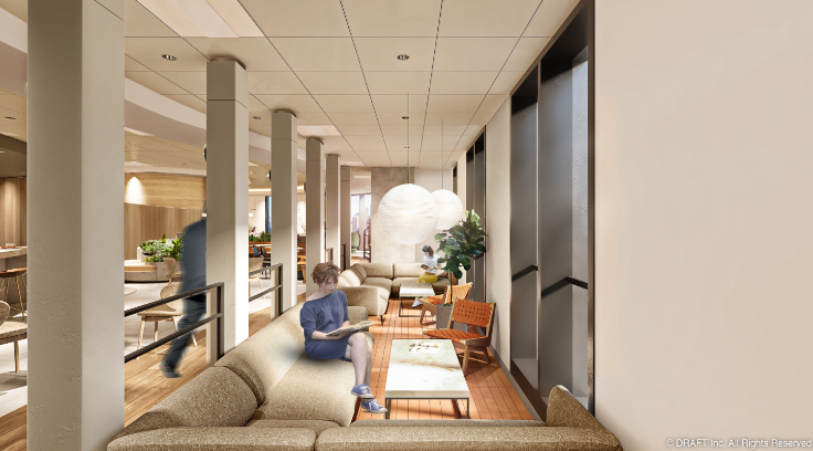 ビルデザインは「大樹」をイメージし、外観には木調パネルを使用。大樹の幹となるラウンジは、成長の軌跡を繊細に表した「年輪」をコンセプトに、ラウンジを利用することで働く方の繋がり・成長・変化のきっかけとなる、ビル入居者専用のコミュニケーションラウンジとなっています。
