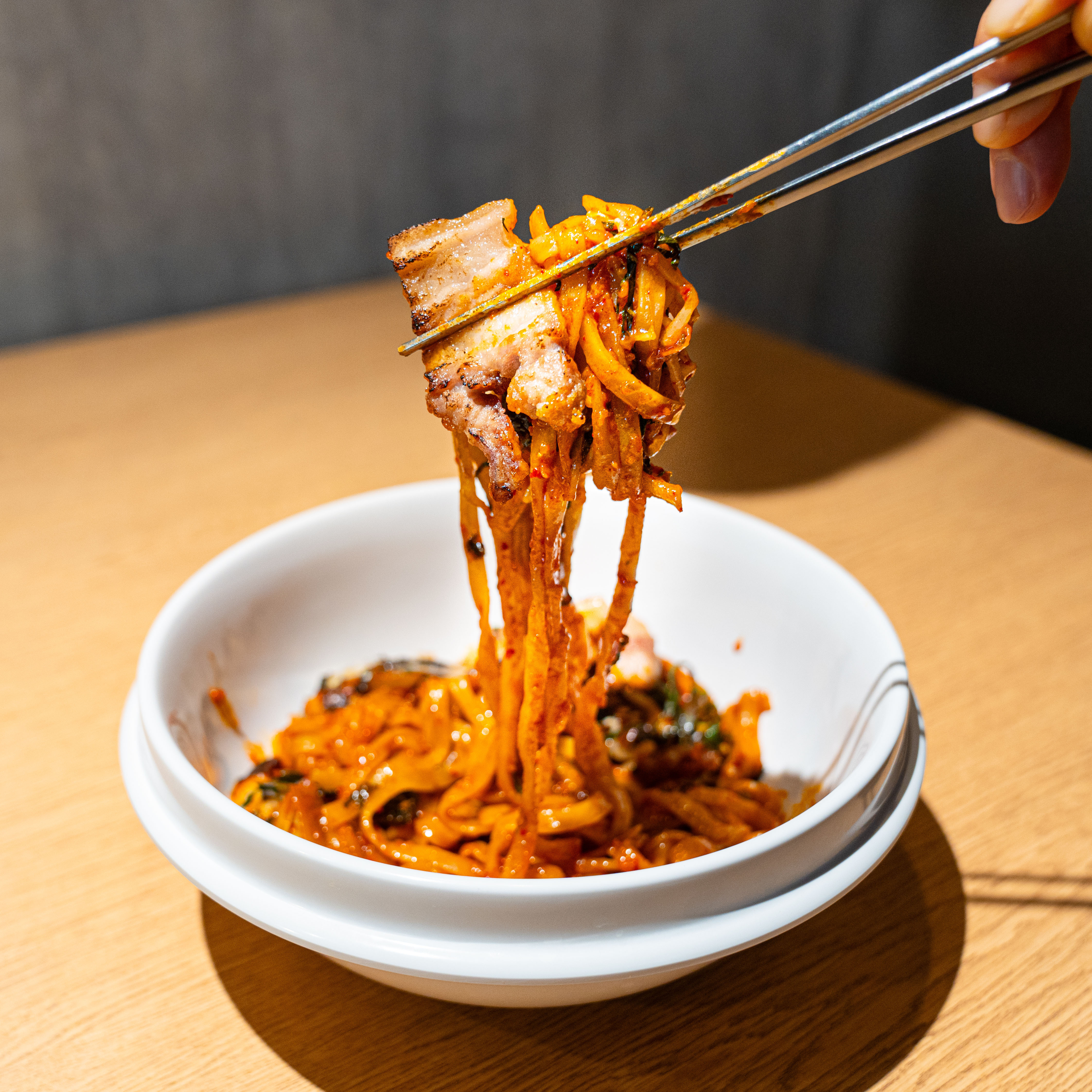 今韓国の美食家たちの間で話題沸騰中の「カルナク」とは、韓国式スープうどん「カルククス」+「ナクチ(タコ)」の略で、カルククスのもちもちの麺にさっぱりとした辛味ソースで味を付け、その上から辛く炒めたタコをたっぷりのせた料理です。