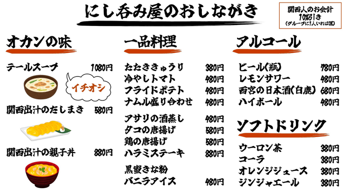 「にし呑み屋」のメニューには、お酒に合う一品料理が豊富に揃っています。店主の故郷である兵庫県の味を感じさせる関西風のだし巻き玉子や親子丼など、どこか懐かしさを感じる家庭的な味も楽しめます。