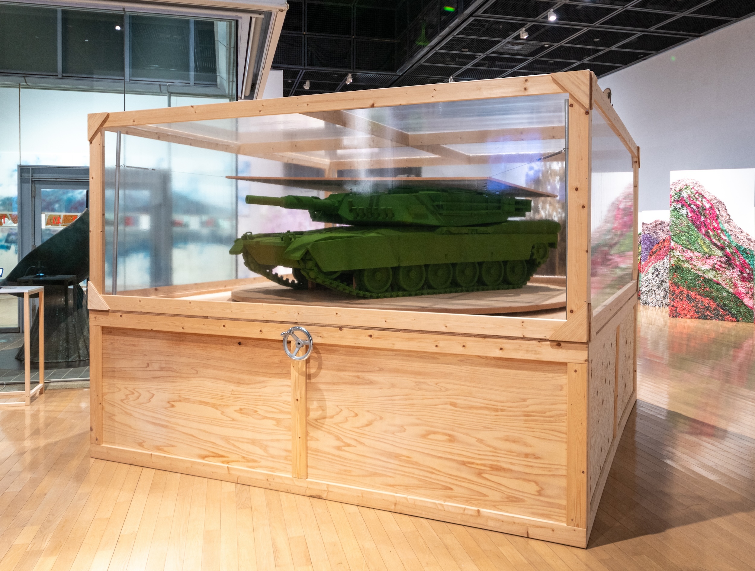 脆いスポンジの素材でつくった戦車を、鑑賞者がハンドルを回すことで少しずつ削られてゆくというリアリティーは、面白さの中に、遠い土地で起こっている戦争という現実に対する感覚のズレを呼び起こし、私達の日常を認識するために、現実をどの様に受け取るかについての彫刻としてのあらたな可能性を示している。作者の遊びの精神が新しい視点や発想を生み出す力となっていて秀逸だ。(福田 美蘭)