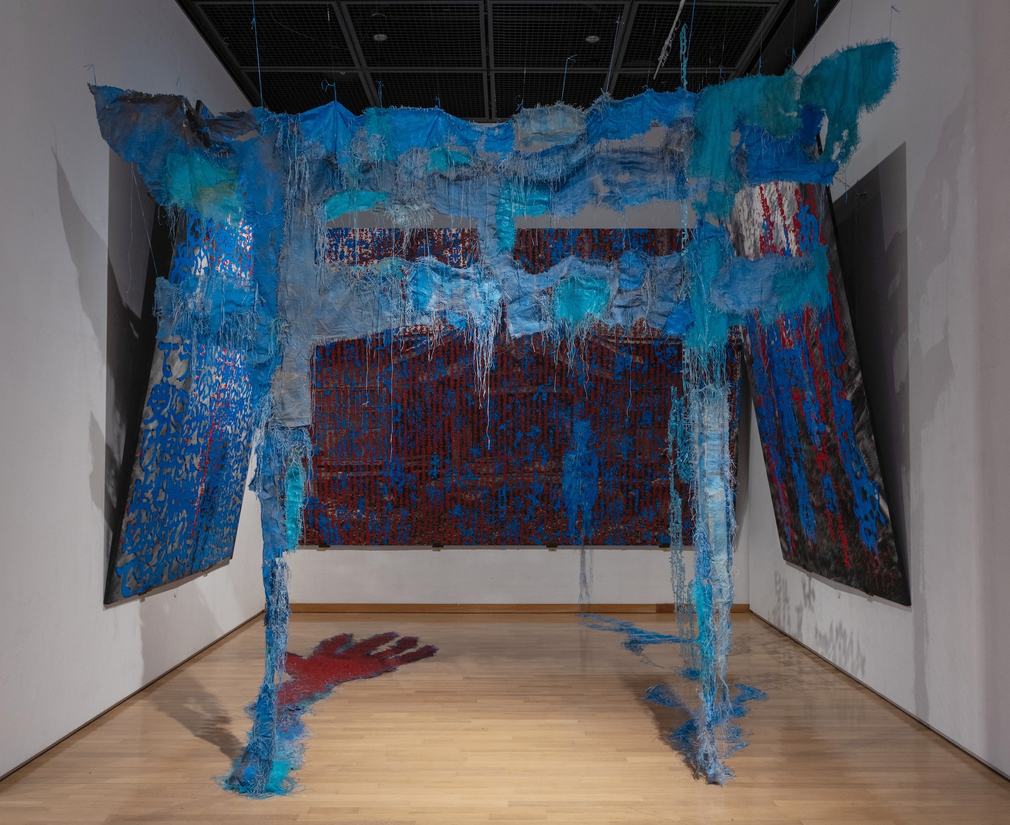 ブルーシートを素材にして制作を続けている作家の最新作。鬼という題材をブルーシートの青と樹脂による赤によって呪文のような祝詞のような文字で埋め尽くされている。現実の出力写真に幾つものレイヤーを重ね、過去とスピリチュアルの世界を重くなり過ぎないように表現することに成功している。展示スペースの入り口にあるブルーシートの鳥居も儚さと時間の経過、精神世界の不可視化を上手く表現できている。(和多利 浩一)