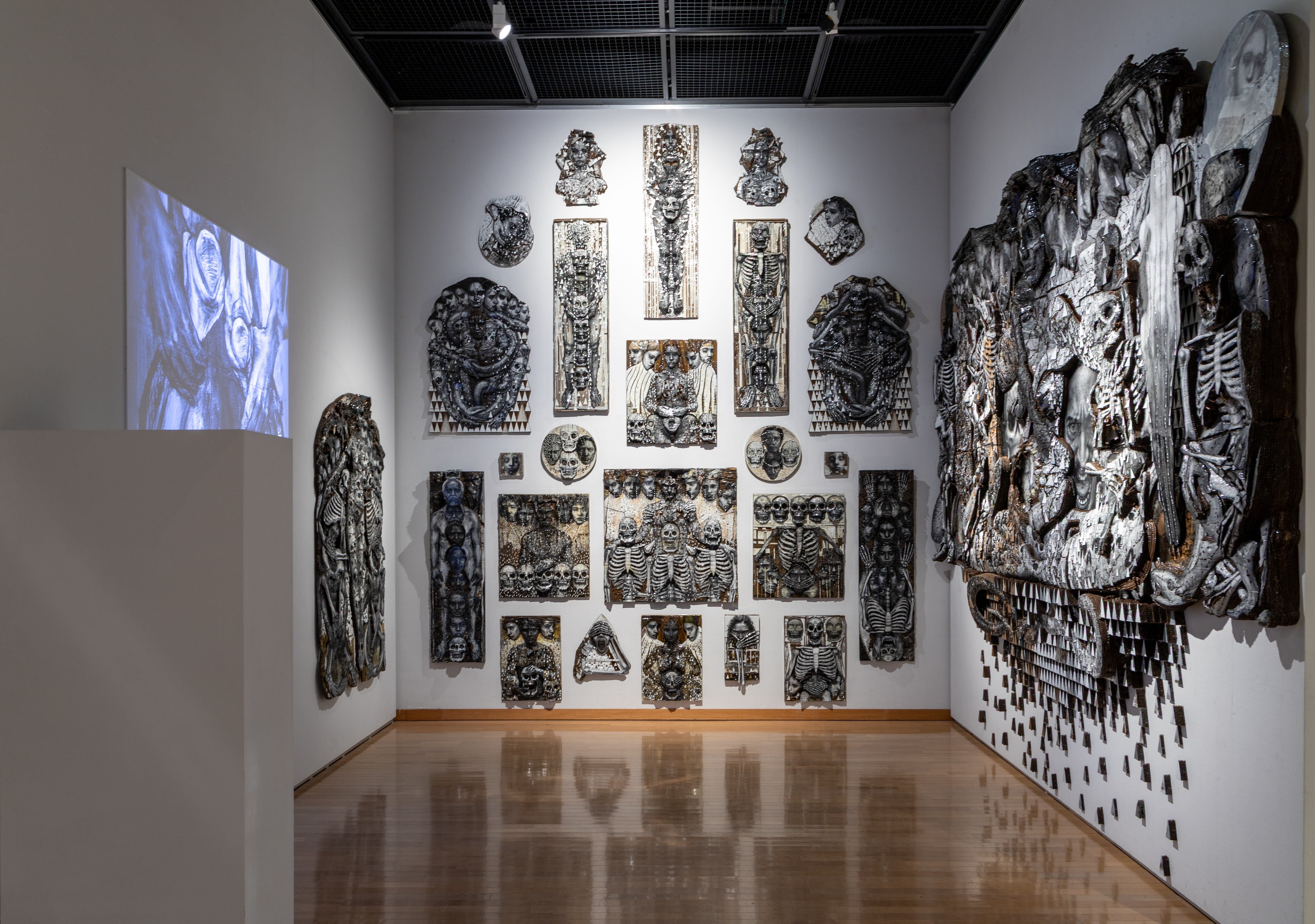 最も強烈なインパクトを与えた作品である。「鬱で得た死生観」をもとにネガティブなエネルギーから出発し、「描き、破壊し、再構築し、固める」という工程を経て、「誕生、死、再生、永遠」を象徴する作品へと昇華させた。そんな制作過程を記録した映像によって、鑑賞者も追体験することができる。段ボールにモノクロームで描かれた自画像、髑髏、女神は樹脂で固められることによって妖しい光を纏う。ネガティブなエネルギーを見事にポジティブに変換した、モニュメンタルな大作である。(山下 裕二)