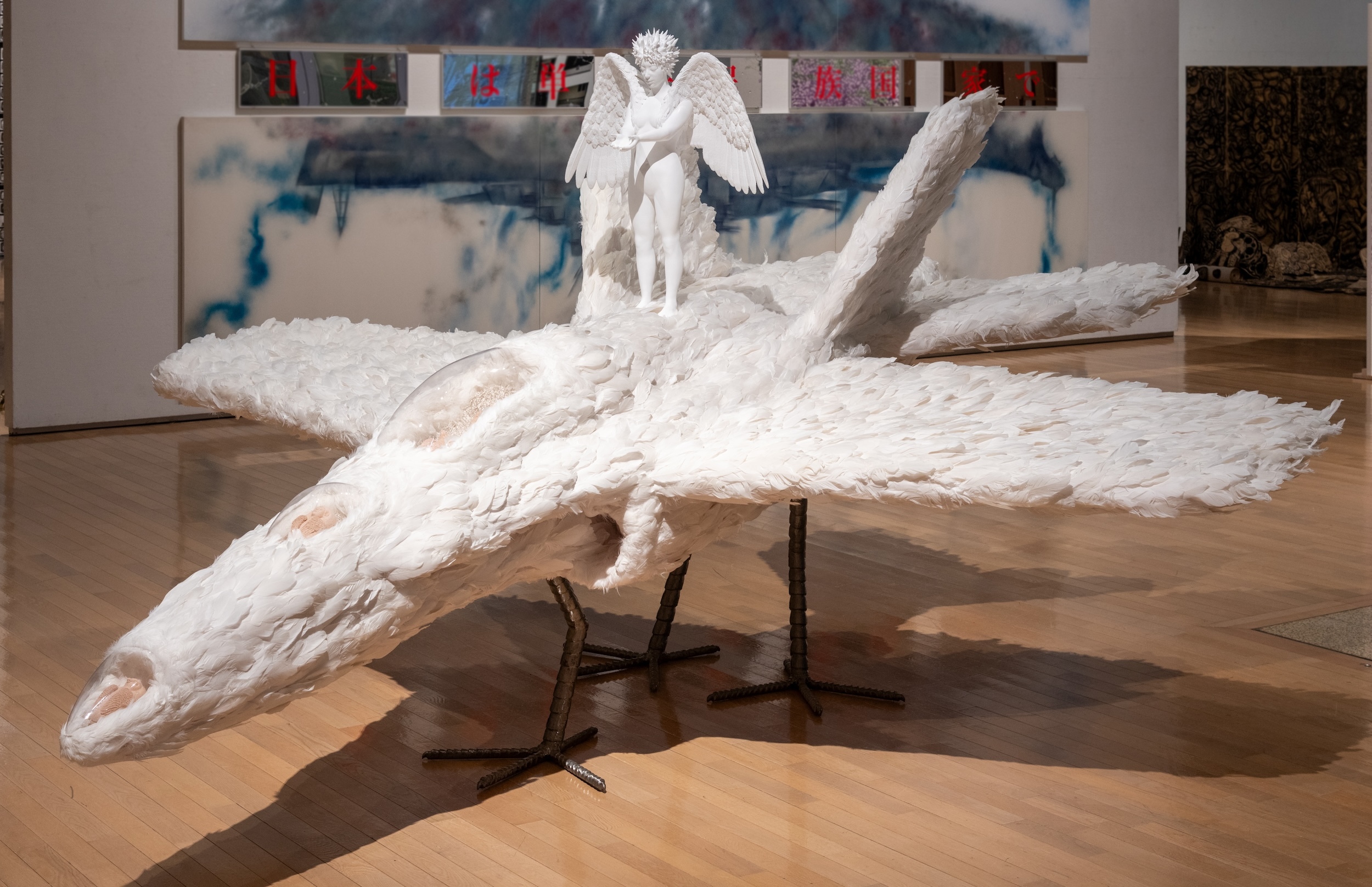 一見して単に戦闘機をかたどった彫刻作品かと思ったが、細部に眼を凝らせば、実は「棺桶」であることに気づく。コクピットの部分には4つの小さな棺が収められており、その中には蛇に飲まれた4羽のメジロの雛の死骸が入っている。戦闘機がまとう鳥の羽根は、なんと約3万枚。弱きものの死を悼み、その再生を願う作者の心情が結晶した作品である。戦闘機の上に載る天使の造形も見事である。(山下 裕二)