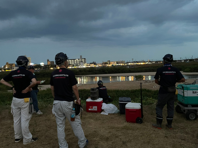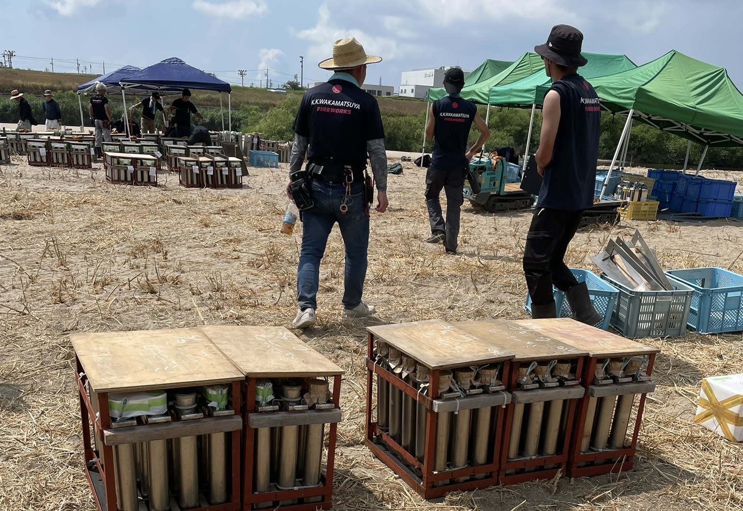 2024年8月15日に愛知県西尾市で開催された第76回米津の川まつりにて、キッシーズの花火師1名が打ち揚げ花火のお手伝いをさせて頂きました。花火の打ち揚げは、愛知県西尾市にある花火の総合商社、株式会社若松屋が請け負い、弊社花火師が打ち子として参加しております。