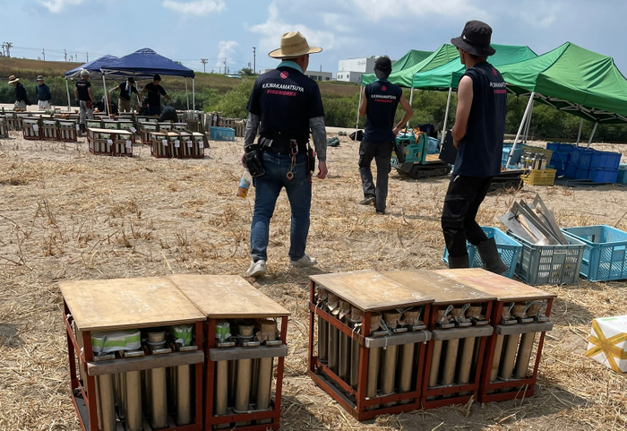 当日の現場は最高気温が36度、非常に日差しが強く、関東地方に近づく台風の影響もあり、にわか雨が降る中作業が行われました。総勢24名にて作業を行い、雨水が花火に影響を及ぼさないようビニールにて防水加工を施しながらの作業となりました。