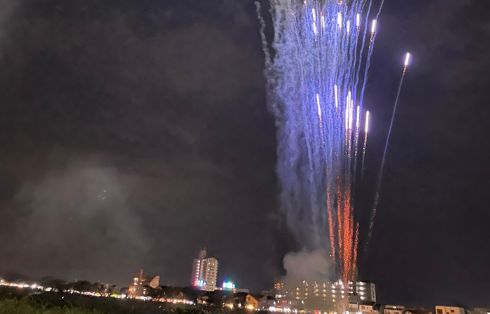 川を挟んだ対岸にはたくさんの露店が立ち並び、多くのおまつり参加者と花火の見物客がいらっしゃいました。そんな中大きな問題もなく3000発の花火を無事に打ち揚げ、皆様の笑顔を作るお手伝いができました。