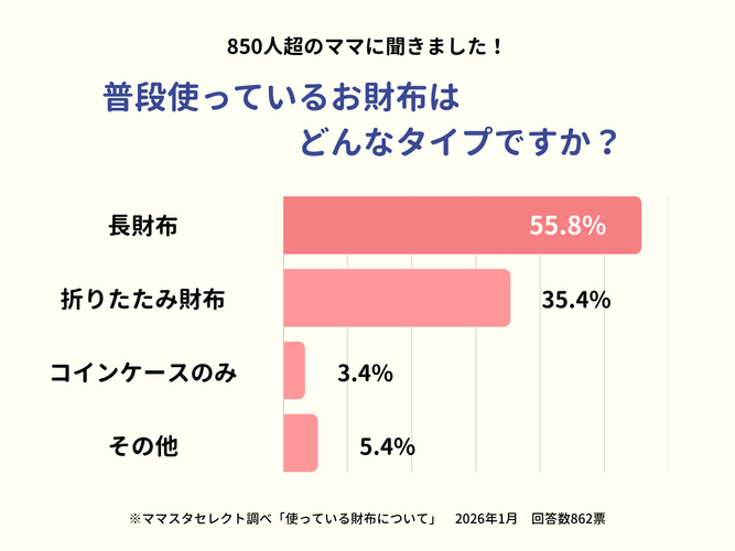 そこでママスタセレクトでは、ママたちが普段どのような財布を使っているのかについてアンケート調査を実施しました。選択肢は「長財布」「折りたたみ財布」「コインケースのみ」「その他」の4択。850人を超えるママたちから回答が集まりました。