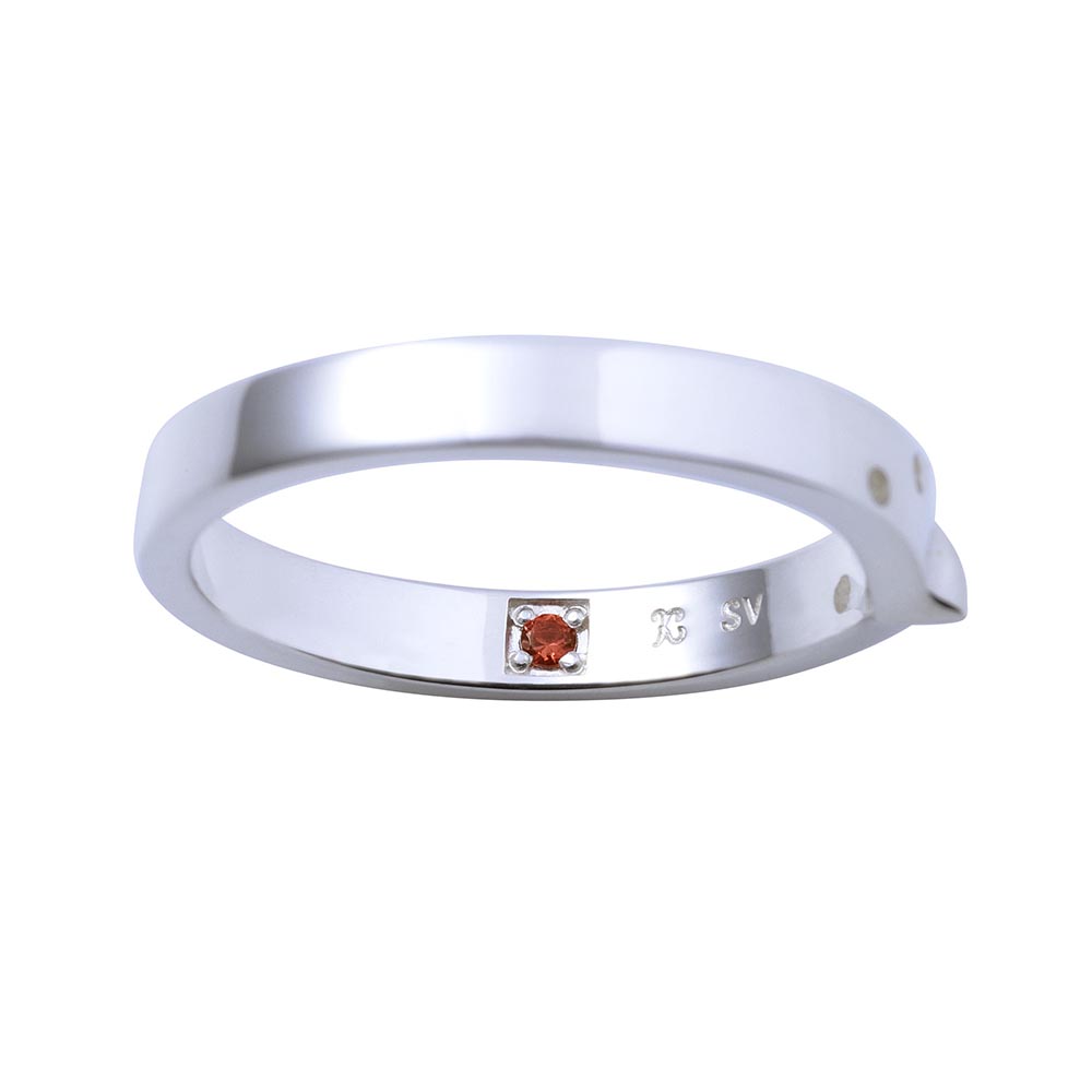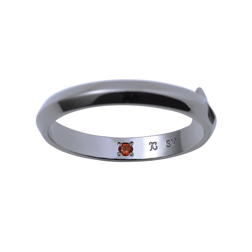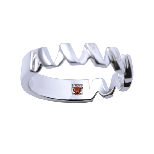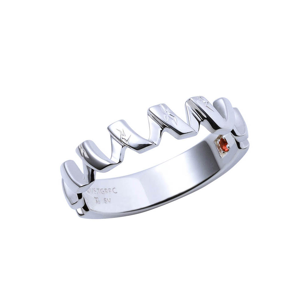 シンプルなストレートフォルムにラビットマスク取り込みました。リングの内側には赫眼をイメージしたレッドのストーンを留めました。