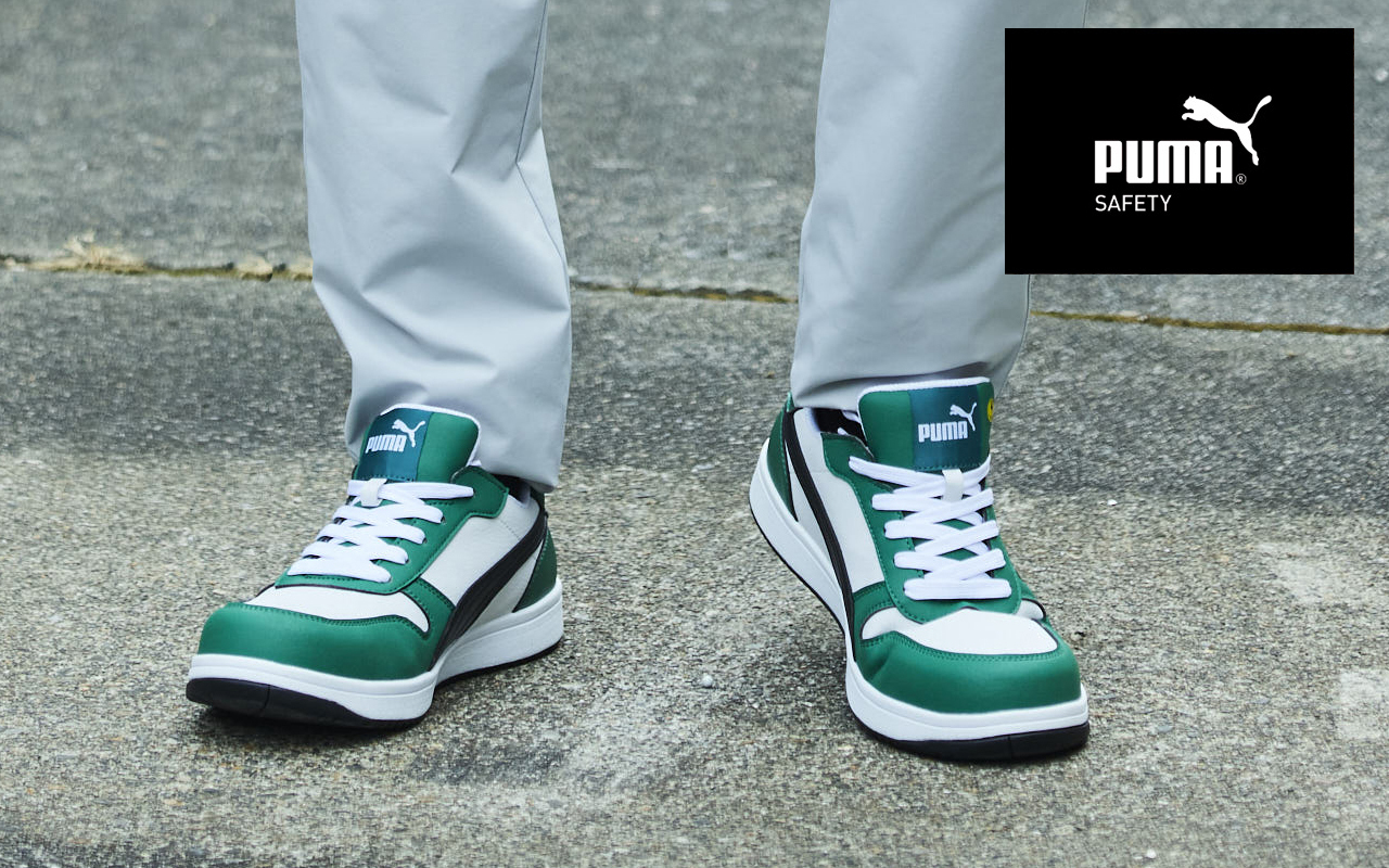 PUMAのセーフティシューズライン“PUMA SAFETY”は、作業現場でのケガのリスクから足を守る安全性に、スポーツブランドならではのテクノロジーを融合。スタイリッシュで、普段履きにもなじむスポーティーなデザインが特徴です。