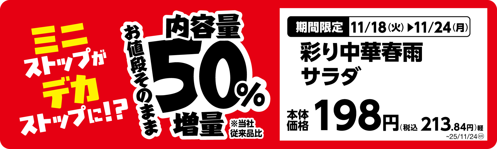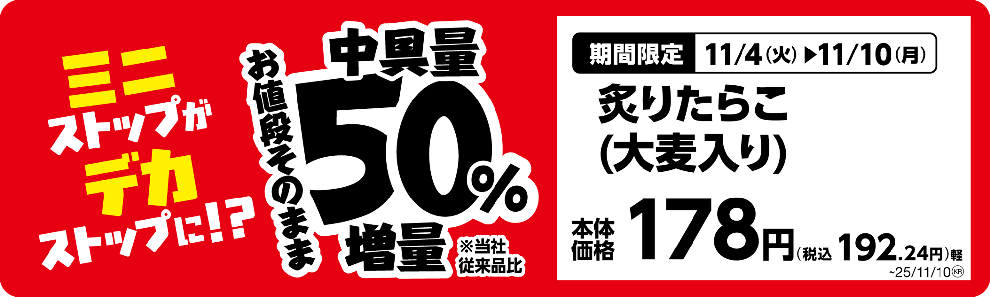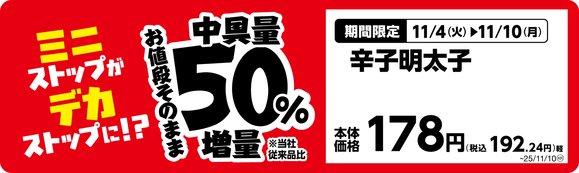 ミニストップは、日頃のご愛顧に感謝の気持ちを込めまして、「ミニストップがデカストップに!?」と題して、11月4日(火)から順次、お値段そのままで増量商品を発売します。Xフライドポテト1.5倍、対象のおにぎり、唐揚弁当、納豆巻、海鮮丼、焼きそば、コールスローなどが50%増量、対象の菓子パン、ダブルクリームシューが30%増。その他にも、ウインナーを2本入れたホットドッグ(ダブルウインナー)、対象のサンドイッチ1層増など、全20品増量商品を続々発売します。(※1)