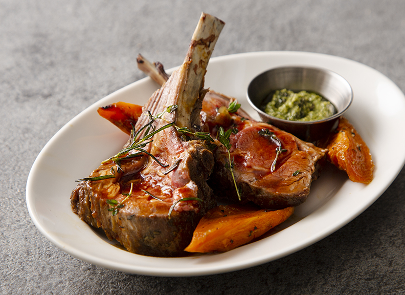 肉厚にカットしたラムチョップは、オーブンでゆっくりと熱を入れ、しっとりと柔らかくジューシーに仕上げました。ラム特有の香りと旨みを存分に楽しめる魅力的な一皿は、お酒との相性も抜群。ぜひ、バジルやミントを使用したソースと合わせてお楽しみ下さい。