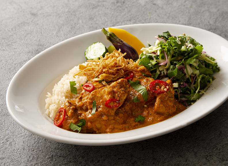 バター、クリーム、トマトベースのカレーは、香り高いガラムマサラやターメリック、刺激的な香りが特徴のクミンなど、香辛料がたっぷりと入ったスパイシーで食欲そそる味わいに仕上げました。